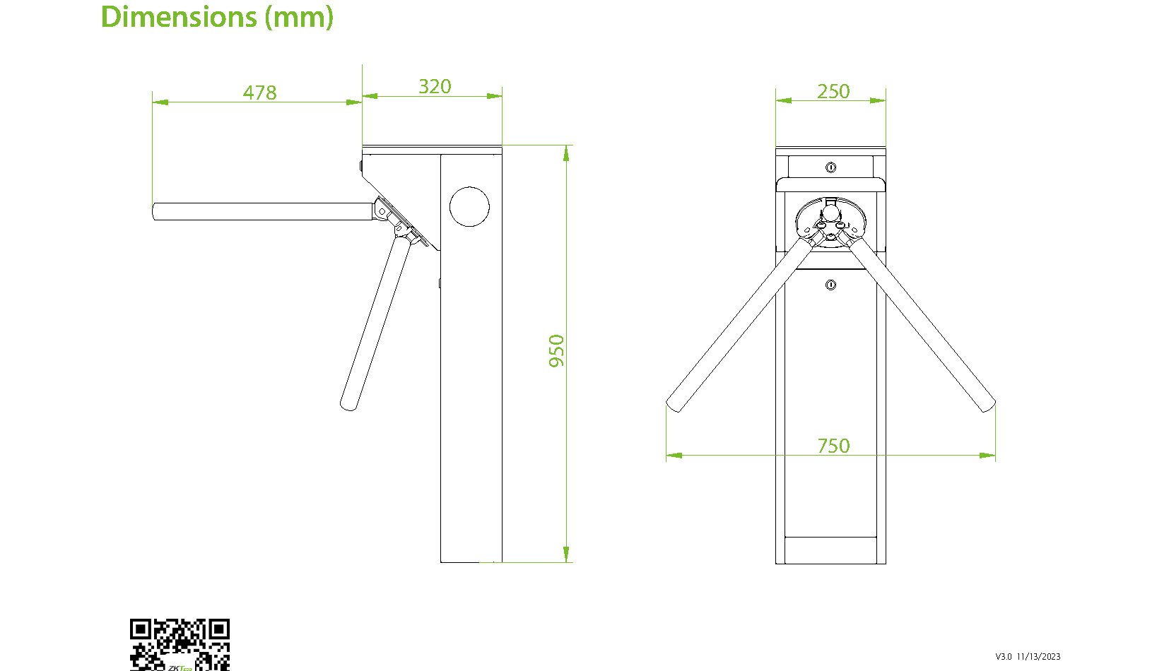 Torniquete trípode bidireccional perteneciente a la serie mTS1000 de ZKTeco, modelo mTS1011, que integra controlador y lector RFID de fábrica. Su diseño compacto reduce la huella de instalación a solo 138 × 250 mm, con un gabinete íntegramente fabricado en acero inoxidable SUS304 y tapa superior en acrílico con vidrio. El equipo opera en ambos sentidos de paso con una velocidad de hasta 25 personas por minuto, proporcionando alto rendimiento en zonas de tránsito intenso.